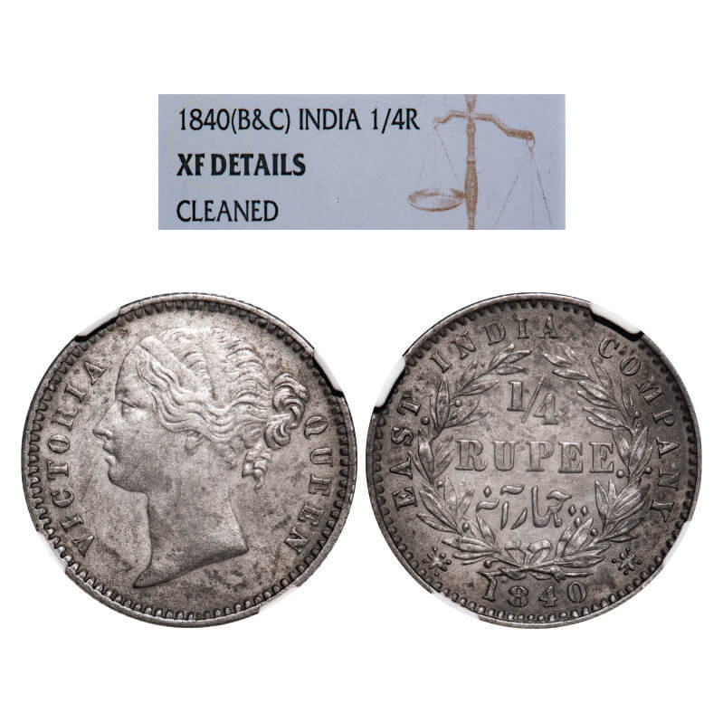 | Victoria Queen, Silver, 1/4 Rupee, 1840, DL, Calcutta Mint, W.W. raised, Numeral '4' w/o serif, Wreath with 10 Berries (6L + 4R). GK 197, F. Prid 105. NGC Slabbed XF Details, Cleaned. Scarce. |