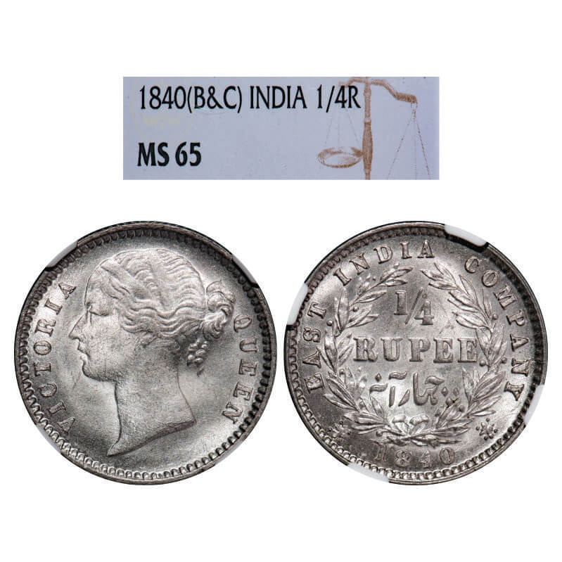 | Victoria Queen, Silver, 1/4 Rupee, 1840, DL, Calcutta Mint, W.W. raised, Wreath with 10 Berries (6L + 4R), Short cross bar of numeral '4', Die rotation on Rev. GK 198, F. Prid Unlisted. NGC Slabbed MS 65. Very Rare. |