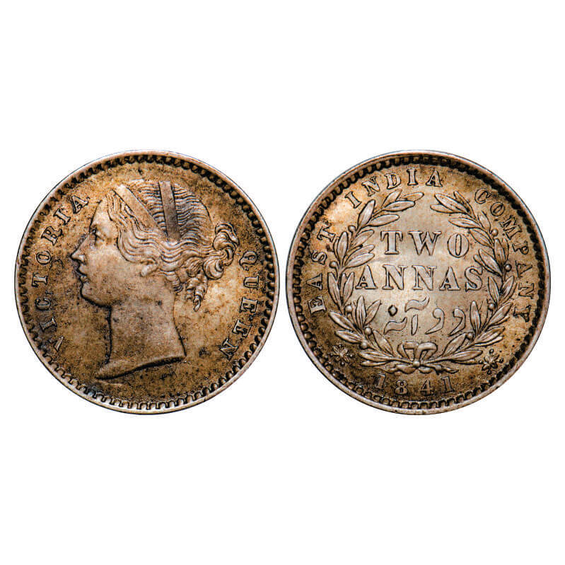 | Victoria Queen, Silver, 2 Annas, 1841, DL, Calcutta Mint, W.W. raised, Wreath with 9 Berries (5L + 4R). GK 216, F. Prid 121. About Uncirculated. Scarce. |