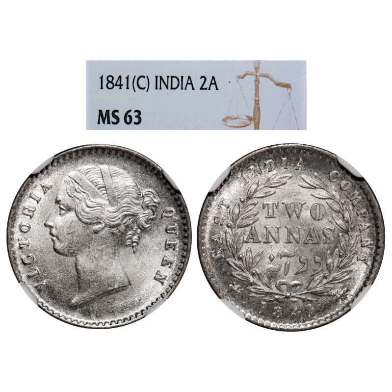 | Victoria Queen, Silver, 2 Annas, 1841, DL, Calcutta Mint, W.W. raised, Wreath with 9 Berries (5L + 4R). GK 216, F.Prid 121. NGC Slabbed MS 63. Rare. |
