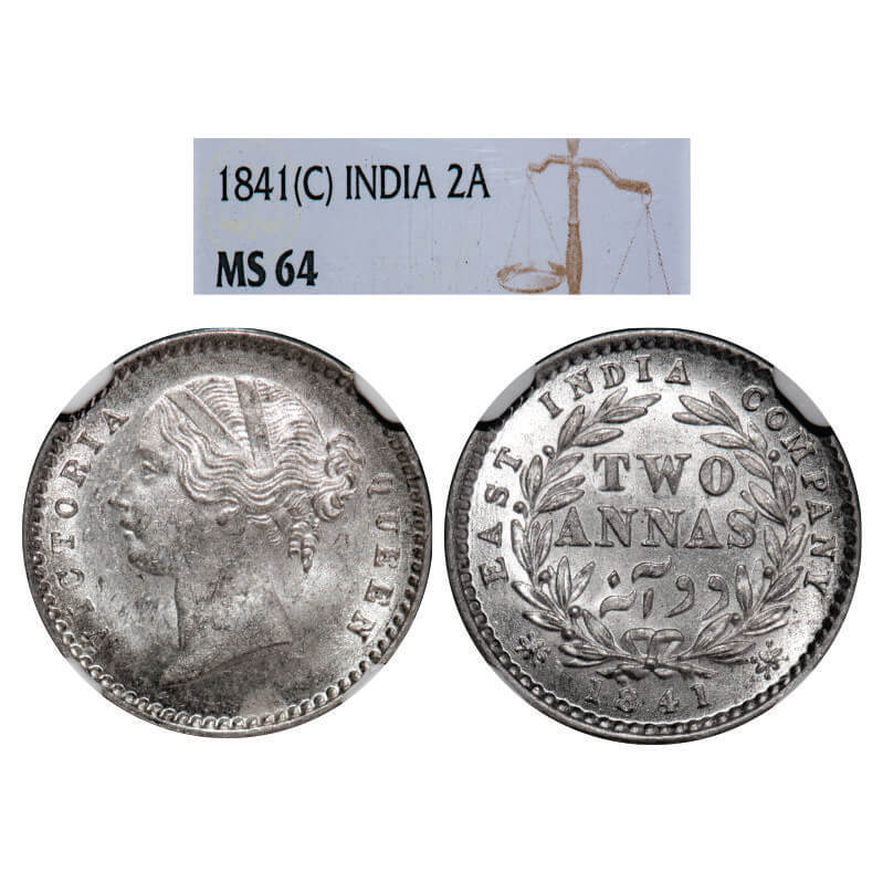 | Victoria Queen, Silver, 2 Annas, 1841, DL, Calcutta Mint, W.W. raised, Wreath with 9 Berries (5L + 4R). GK 216, F. Prid 121. NGC Slabbed MS 64. Rare. |