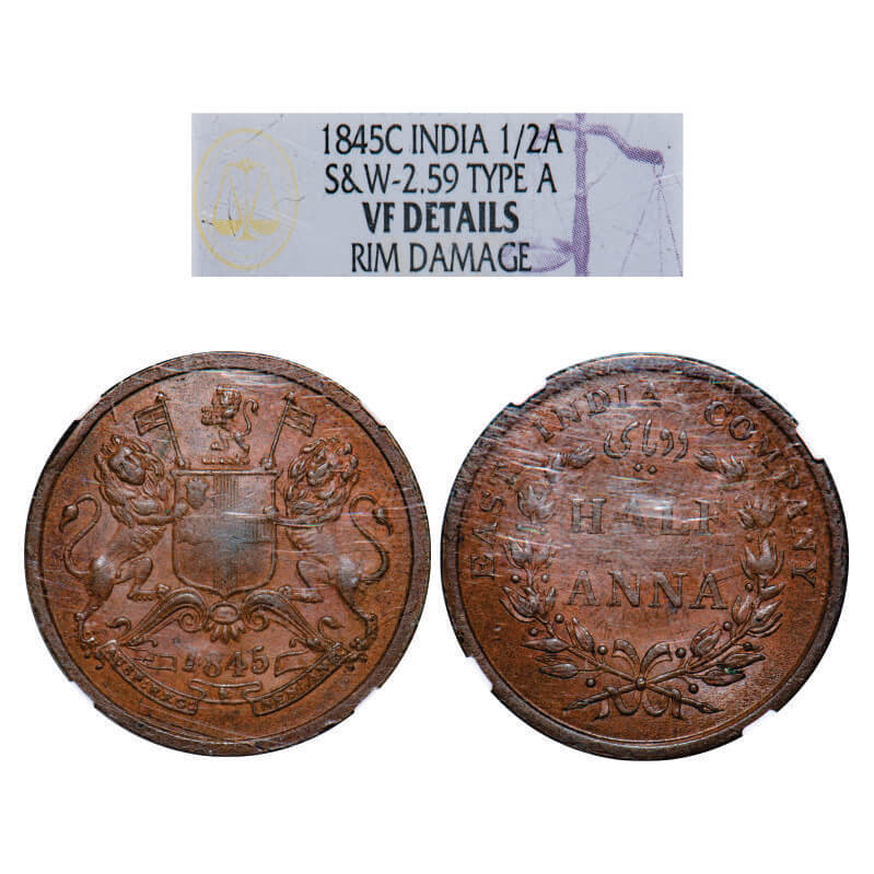| Victoria Queen, Copper, Half Anna, 1845, Calcutta Mint, Obv A, Cross bar of numeral 4 of year 1845 with serif pointing upwards. GK 144, F. Prid 137. NGC Slabbed VF Details, Rim damaged. Scarce. |