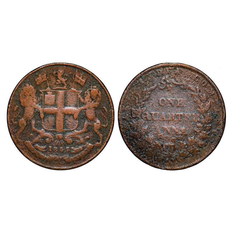 Victoria Queen, Copper, Quarter Anna, 1857, R. Heaton & Sons, Birmingham Mint, Single leaf, Rev inverted. GK 229, F. Prid 151. Fine. Scarce.