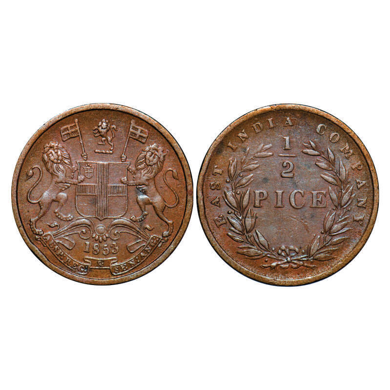 Victoria Queen, Copper, 1/2 Pice, 1853, Calcutta Mint, B/I, Elongated beads above year numerals, Wreath with 19 Berries (10L + 9R). GK 235. Uncirculated. Scarce.