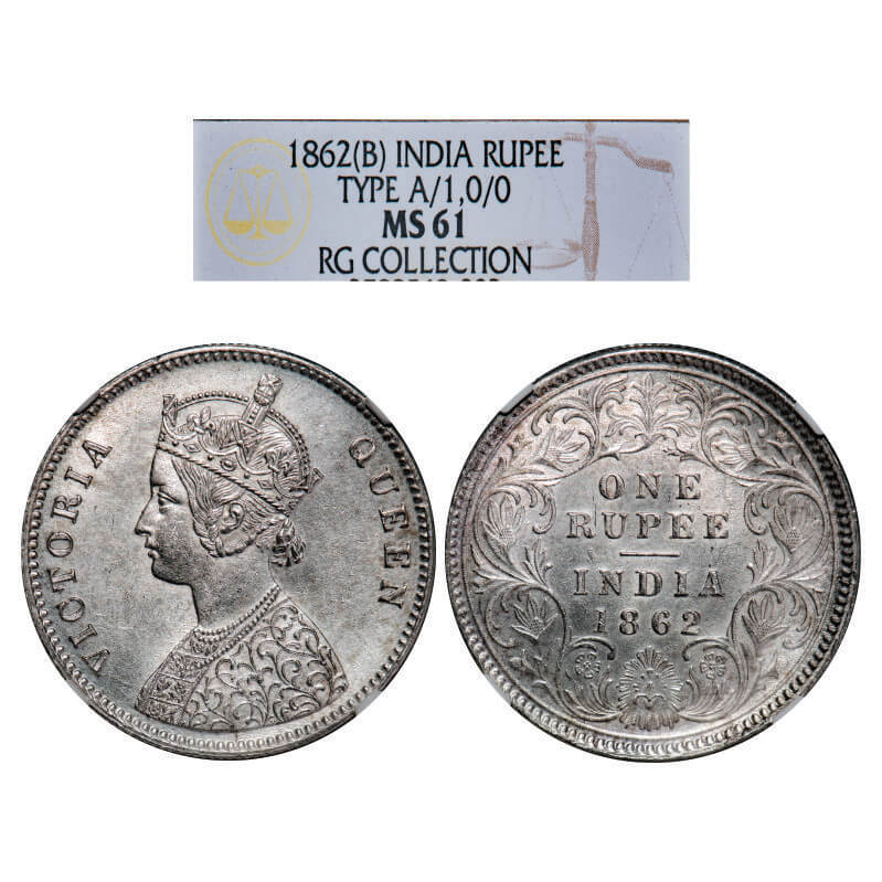 Victoria Queen, Silver, Rupee, 1862, Calcutta Mint, A/I. GK 257. NGC Slabbed MS 61. Rare.