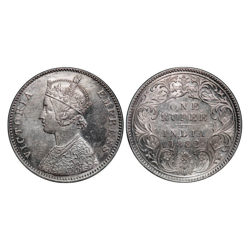 Victoria Empress, Silver, Rupee, 1882, Bombay Mint, A3/I, Dot, Ghost on Rev. GK 474, F. Prid 160. About Uncirculated. Scarce.