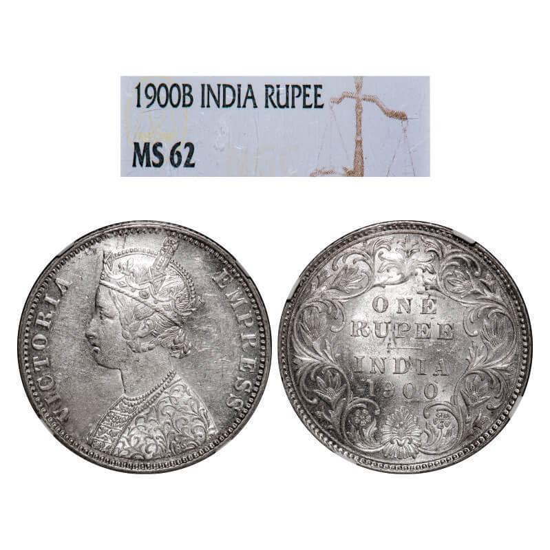 Victoria Empress, Silver, Rupee, 1900, Bombay Mint, A3(i)/I(ii), 'B' incused. GK 589, F. Prid 186. NGC Slabbed MS 62. Rare.