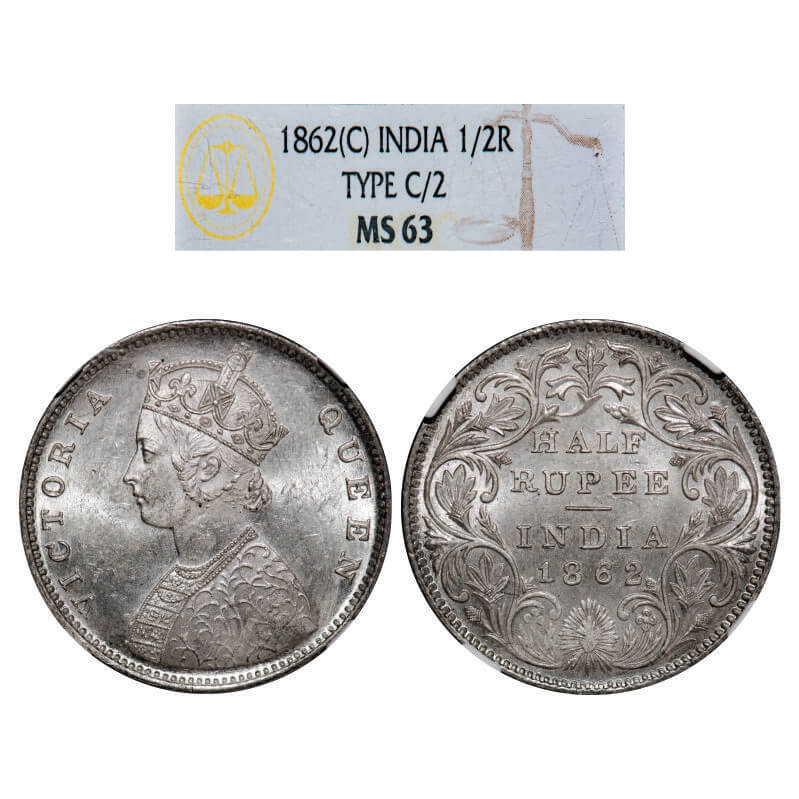 | Victoria Queen, Silver, Half Rupee, 1862, Calcutta Mint, C/II, Round pearls, 5 petals flower at 4 & 8 clock position has raised vains in centre of the petals. GK 367, F. Prid 252. NGC Slabbed MS 63. Rare. |