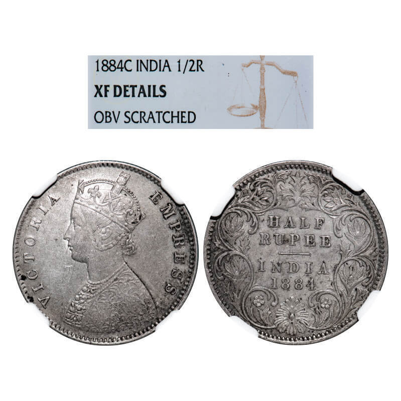 | Victoria Empress, Silver, Half Rupee, 1884, Calcutta Mint, A/I, 'C' incused. GK 628, F. Prid 268. NGC Slabbed XF Details, Obv scratched. Very Scarce. |