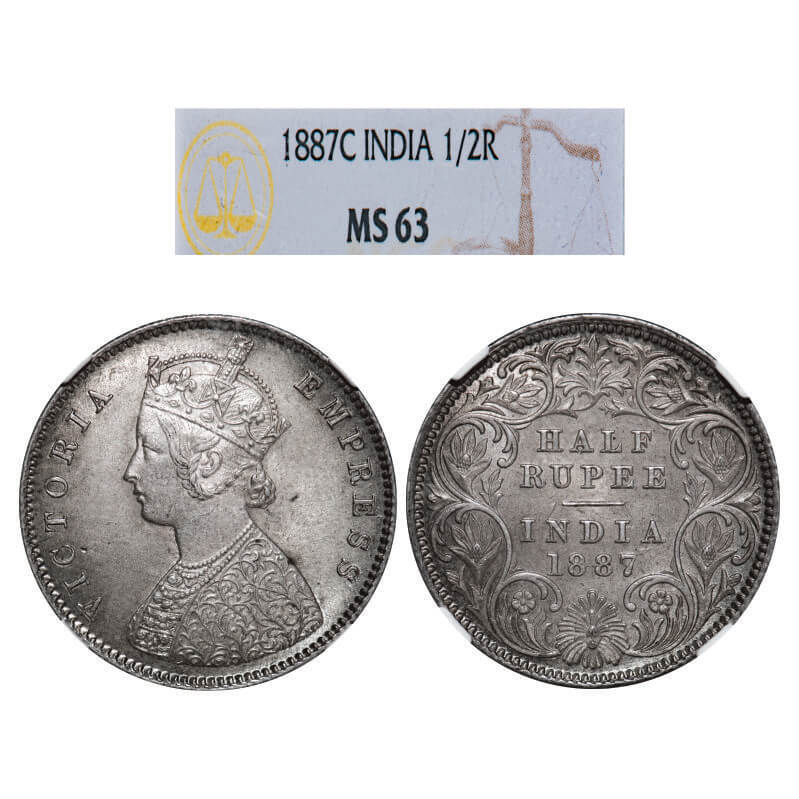 Victoria Empress, Silver, Half Rupee, 1887, Calcutta Mint, A/I, 'C' incused. GK 637, F. Prid 271. NGC Slabbed MS 63. Rare.