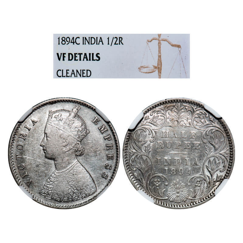 | Victoria Empress, Silver, Half Rupee, 1894, Calcutta Mint, A/I, 'C' incused. GK 651, F. Prid 278. NGC Slabbed VF Details, Cleaned. Scarce. |