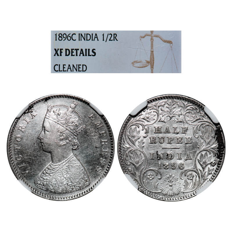 | Victoria Empress, Silver, Half Rupee, 1896, Calcutta Mint, A/I, 'C' incused. GK 652, F. Prid 279. NGC Slabbed XF Details, Cleaned. Scarce. |