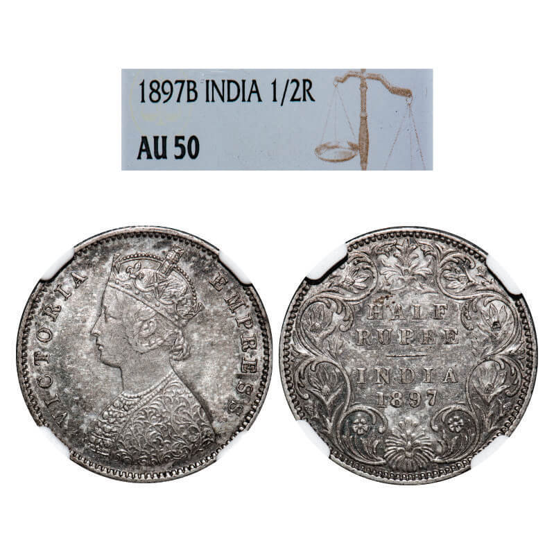 | Victoria Empress, Silver, Half Rupee, 1897, Bombay Mint, A/I, 'B' incused, Traces of numeral '6' seen behind numeral '7'. GK 654, F. Prid 305. NGC Slabbed AU 50. Rare. |