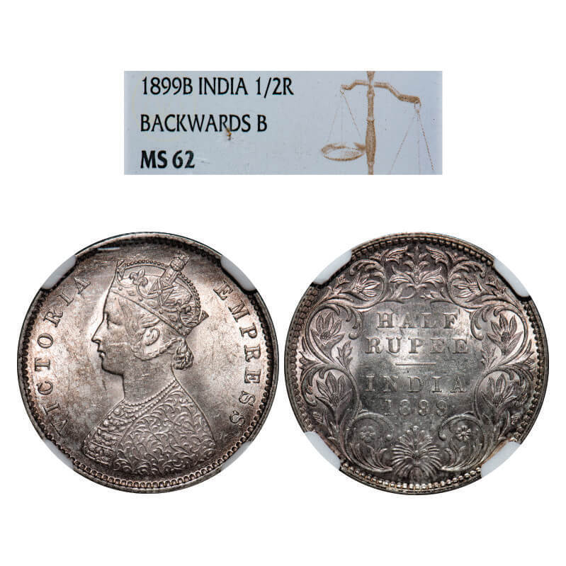 | Victoria Empress, Silver, Half Rupee, 1899, Bombay Mint, A/I, 'B' incused, B incused inverted. GK 662, F. Prid 307. NGC Slabbed MS 62. Rare. |