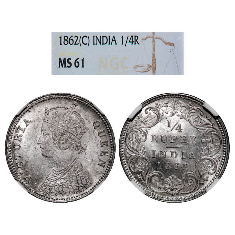 Victoria Queen, Silver, 1/4 Rupee, 1862, Calcutta Mint, A/I. GK 375, F. Prid 376. NGC Slabbed MS 61. Rare.