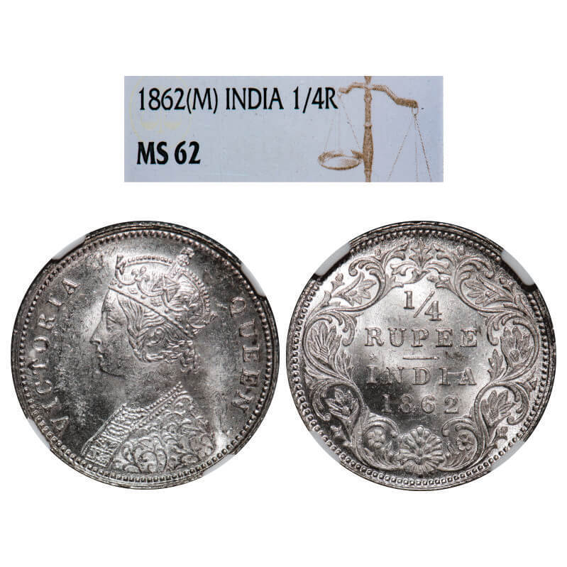 Victoria Queen, Silver, 1/4 Rupee, 1862, Madras Mint, A/I. GK 379, F. Prid 378. NGC Slabbed MS 62. Rare.