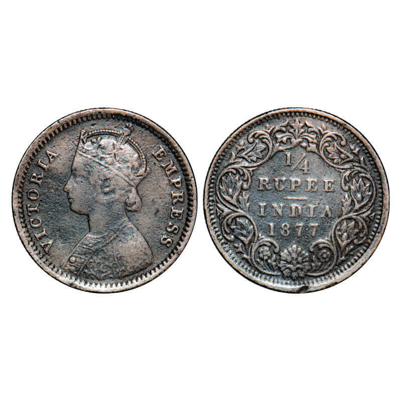 Victoria Empress, Silver, 1/4 Rupee, 1877, Bombay Mint, B/I, Dot. GK 671, F. Prid 409. Fine+, Cleaned. Scarce.