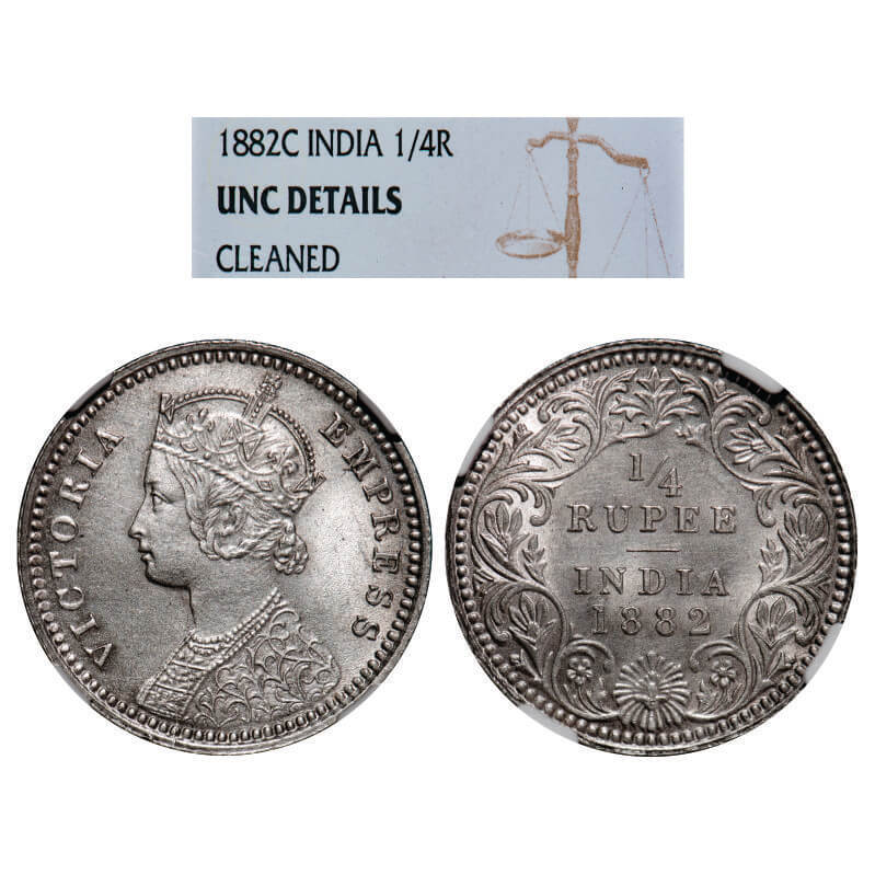 | Victoria Empress, Silver, 1/4 Rupee, 1882, Calcutta Mint, C/II, 'C' incused. GK 687, F. Prid 387. NGC Slabbed UNC Details, Cleaned. Very Scarce. |