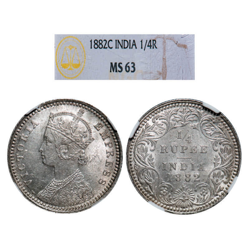 Victoria Empress, Silver, 1/4 Rupee, 1882, Calcutta Mint, C/II, 'C' incused. GK 687. NGC Slabbed MS 63. Very Rare.