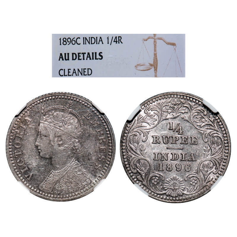 Victoria Empress, Silver, 1/4 Rupee, 1896, Calcutta Mint, C/II, 'C' incused. GK 728. NGC Slabbed AU Details, Cleaned. Scarce.