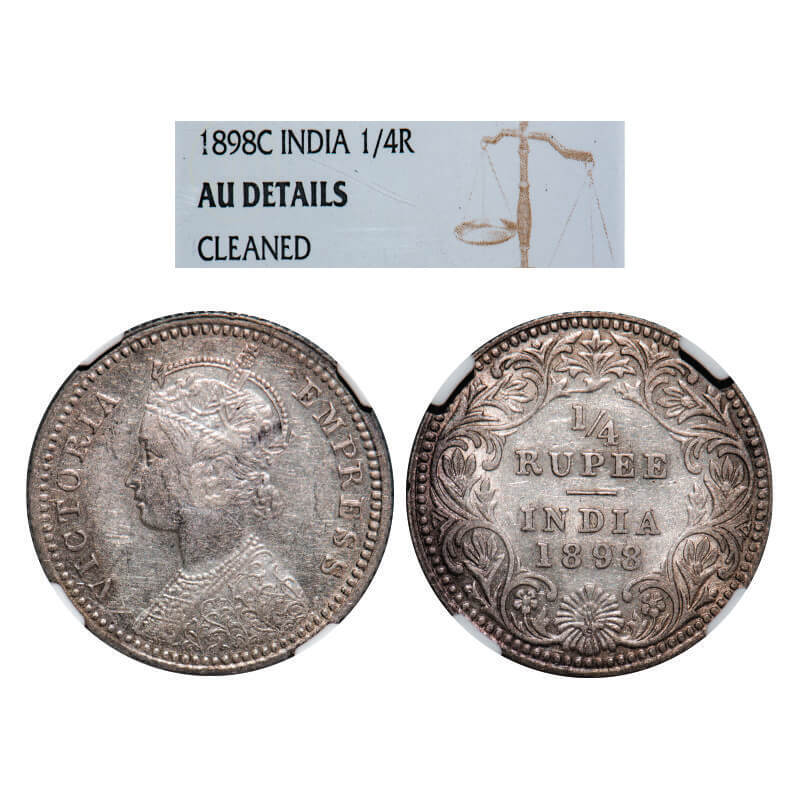 Victoria Empress, Silver, 1/4 Rupee, 1898, Calcutta Mint, C/II, 'C' incused. GK 735. NGC Slabbed AU Details, Cleaned. Scarce.
