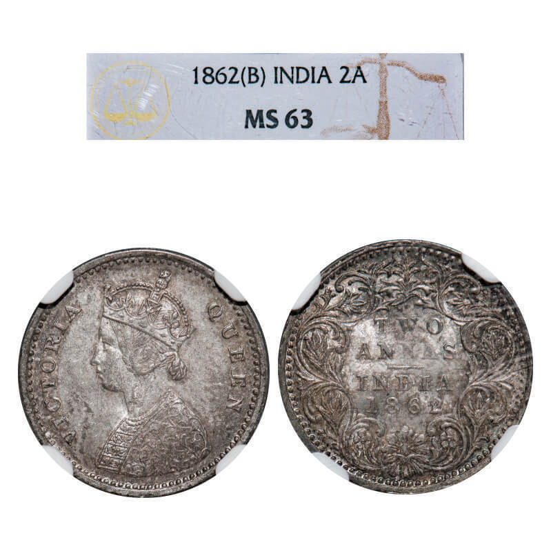 Victoria Queen, Silver, 2 Annas, 1862, Bombay Mint, A/I, Bottom flower centre top petal broader than left and right connecting petals. GK 383. NGC Slabbed MS 63. Rare.