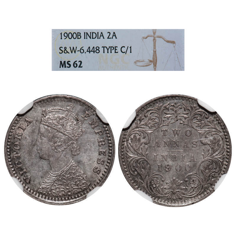 Victoria Empress, Silver, 2 Annas, 1900, Bombay Mint, B/I, 'B' raised, (Mentioned on slab C/I). GK 812. NGC Slabbed MS 62. Rare.