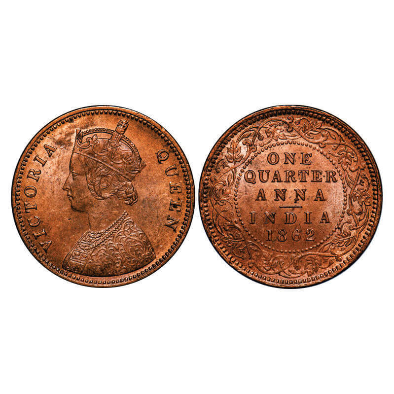 | Victoria Queen, Copper, Quarter Anna, 1862, Madras Mint, A/I, No mint mark, No privy mark, Queen's Nose, Lips and Chin are double strucked. GK 399, F. Prid . 604. Uncirculated. Very Scarce. |