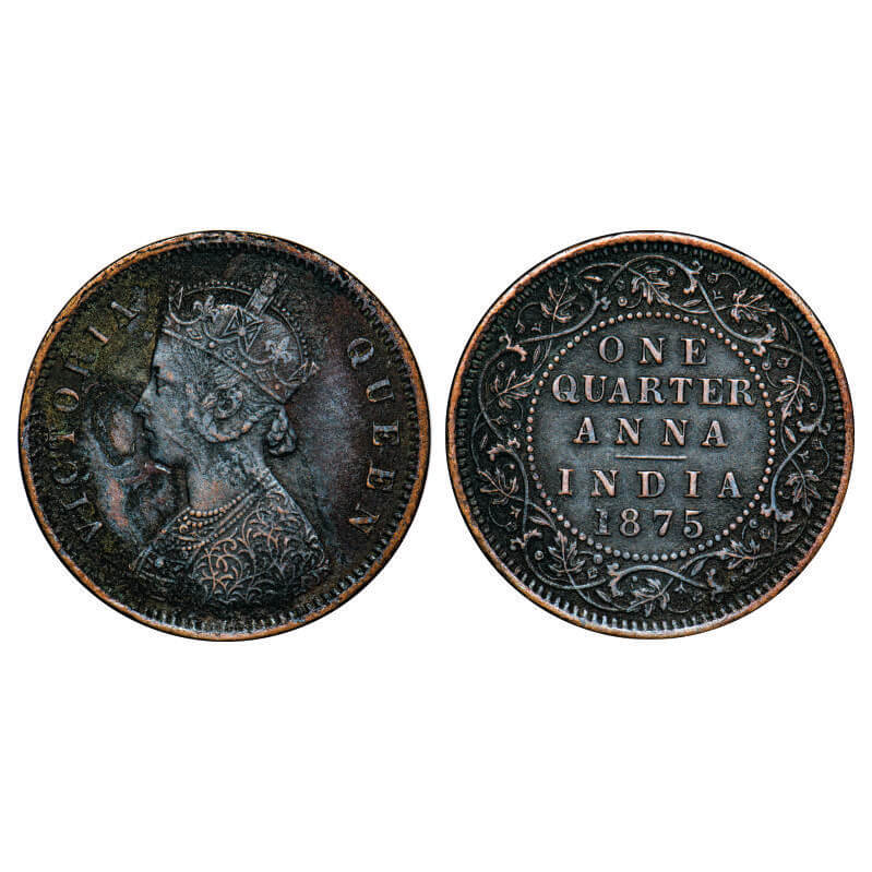 Victoria Queen, Copper, Quarter Anna, 1875, Calcutta Mint, B/II, No mint mark. GK 825, F. Prid 609. Very Fine+. Very Scarce.