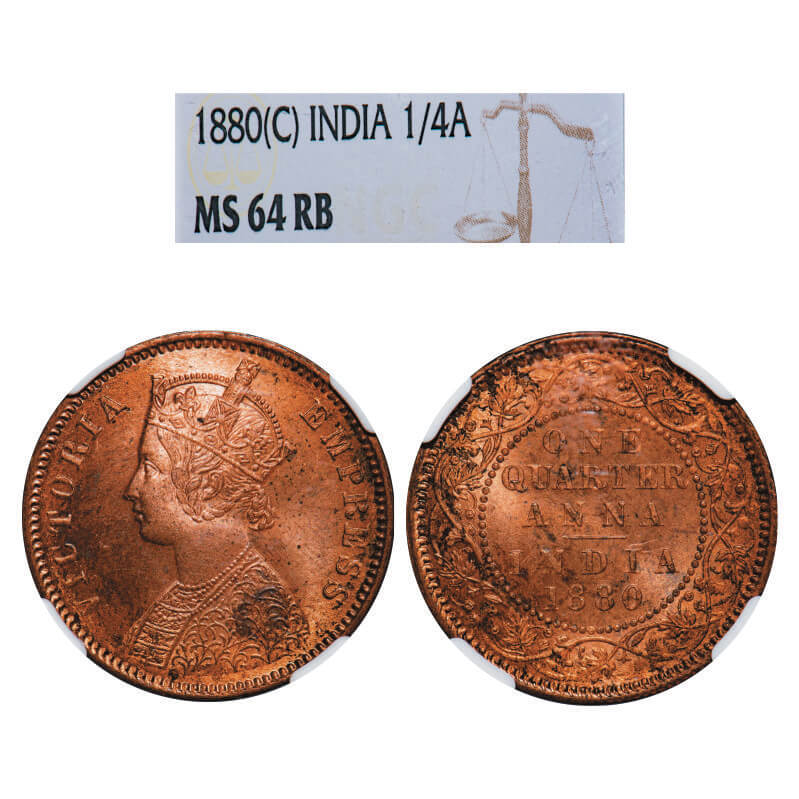 Victoria Empress, Copper, Quarter Anna, 1880, Calcutta Mint, B/II, 'C' incused. GK 833, F. Prid 614. NGC Slabbed MS 64 RB. Rare.