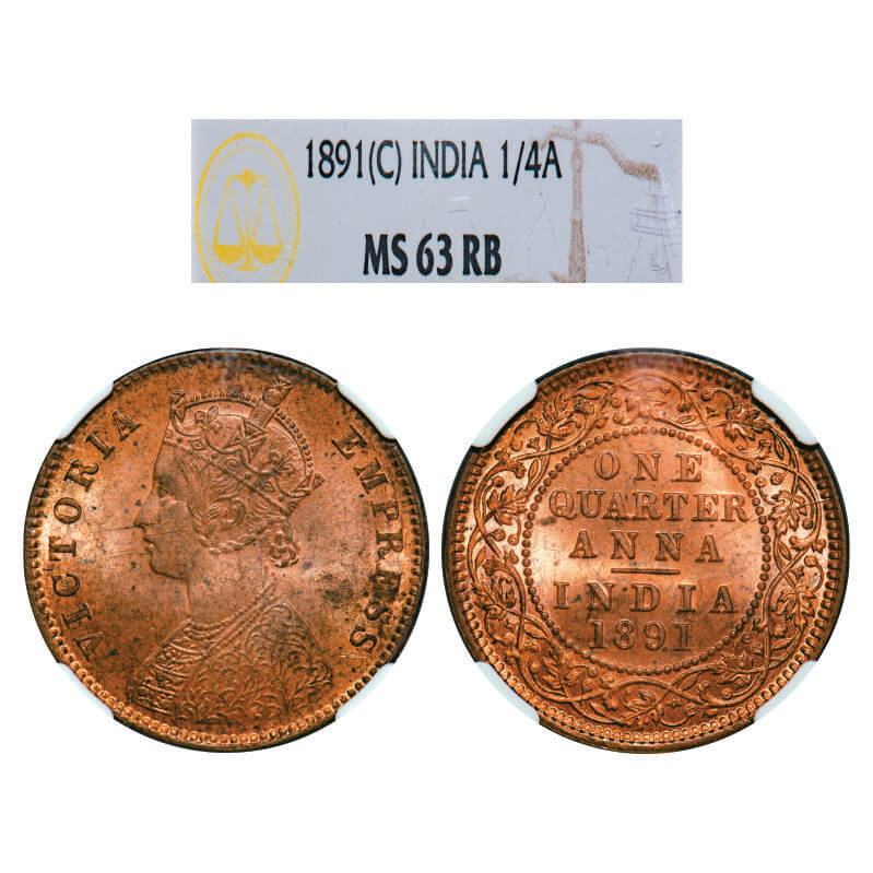 Victoria Empress, Copper, Quarter Anna, 1891, Calcutta Mint, B/II, No mint mark. GK 850, F. Prid 624. NGC Slabbed MS 63 RB. Rare.