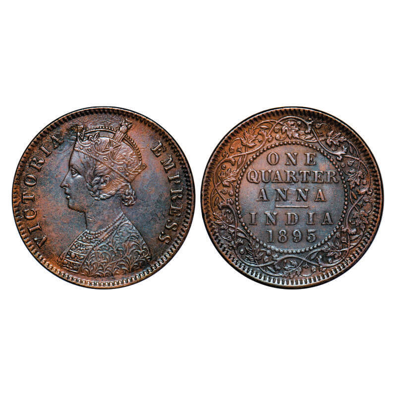Victoria Empress, Copper, Quarter Anna, 1895, Calcutta Mint, B/II, No mint mark. GK 854, F. Prid 628. Almost Uncirculated. Very Scarce.