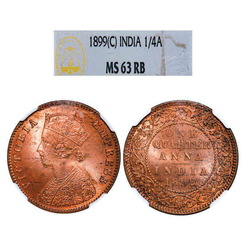 Victoria Empress, Copper, Quarter Anna, 1899, Calcutta Mint, B/II, No mint mark. GK 858, F. Prid 632. NGC Slabbed MS 63 RB. Rare.