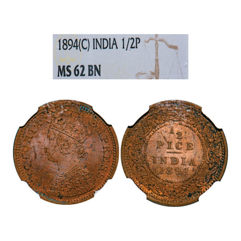 Victoria Empress, Copper, 1/2 Pice, 1894, Calcutta Mint, A/I, No mint mark. GK 874, F. Prid 727. NGC Slabbed MS 62 BN. Rare.