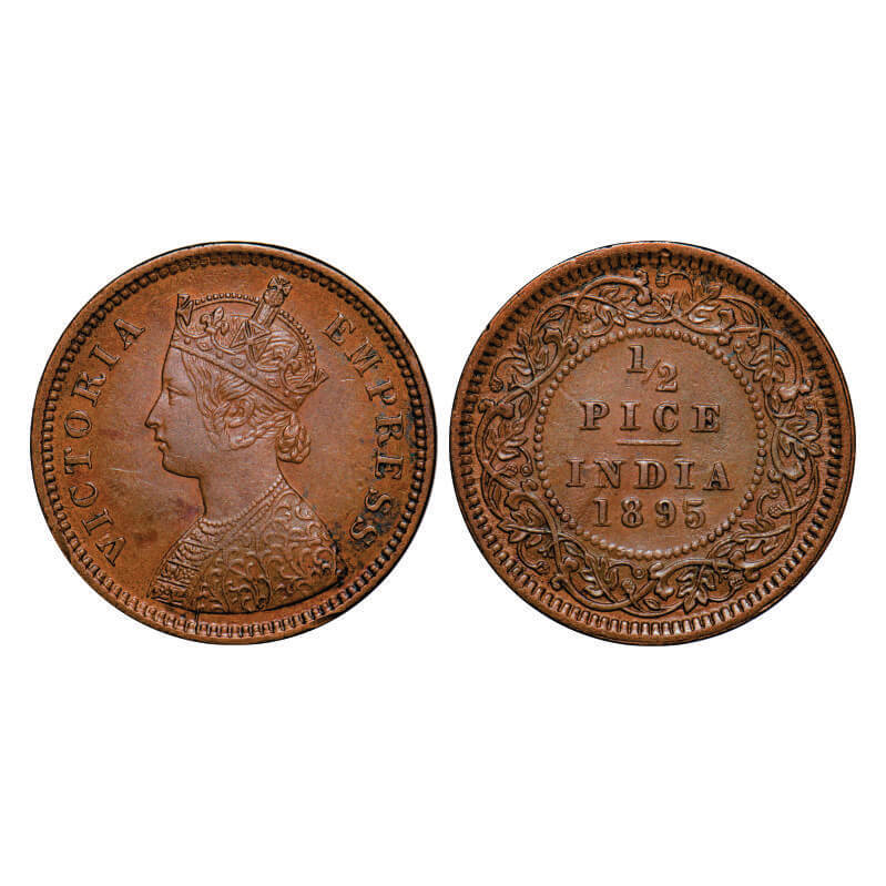 Victoria Empress, Copper, 1/2 Pice, 1895, Calcutta Mint, A/I, No mint mark, Ghost on Rev. GK 875, F. Prid 728. About Uncirculated. Scarce.