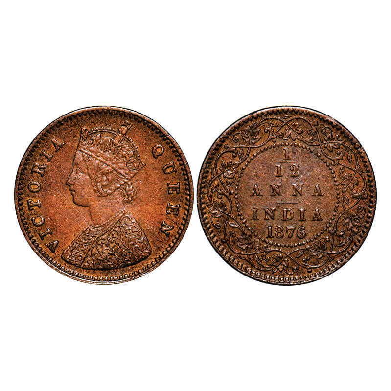 Victoria Queen, Copper, 1/12 Anna, 1876, Calcutta Mint, Obv A, Noa mint mark, Die cracks on Obv. GK 888, F. Prid 785. Extremely Fine+. Very Scarce.