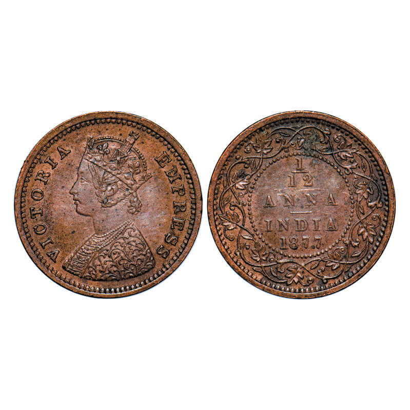 | Victoria Empress, Copper, 1/12 Anna, 1877, Bombay Mint, Obv A, No mint mark. GK 889, F. Prid 809. Almost Uncirculated, Details. Rare. |