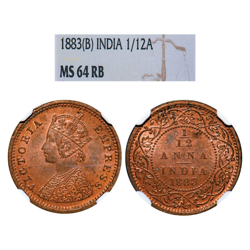 Victoria Empress, Copper, 1/12 Anna, 1883, Bombay Mint, Obv A, No mint mark. GK 895, F. Prid 811. NGC Slabbed MS 64 RB. Very Rare.