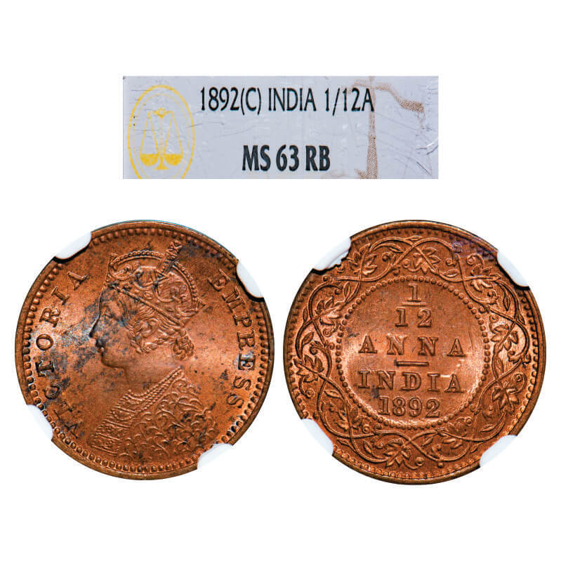 Victoria Empress, Copper, 1/12 Anna, 1892, Calcutta Mint, Obv B, No mint mark. GK 913, F. Prid 797. NGC Slabbed MS 63 RB. Rare.
