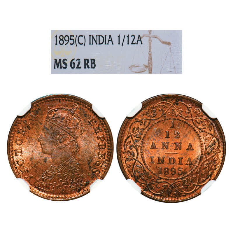 Victoria Empress, Copper, 1/12 Anna, 1895, Calcutta Mint, Obv B, No mint mark. GK 916. NGC Slabbed MS 62 RB. Rare.