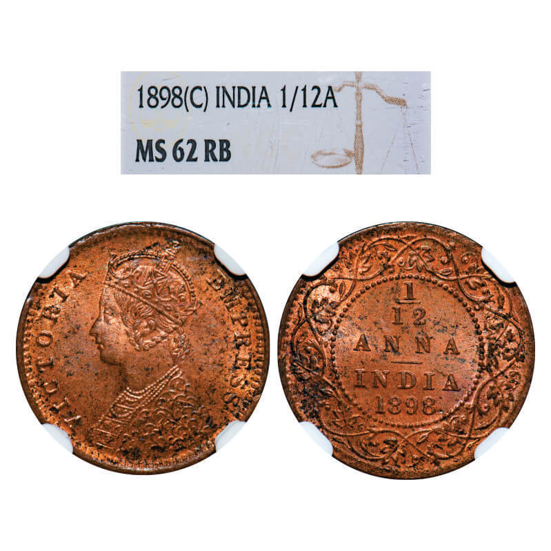 Victoria Empress, Copper, 1/12 Anna, 1898, Calcutta Mint, Obv B, No mint mark. GK 919, F. Prid 803. NGC Slabbed MS 62 RB. Rare.