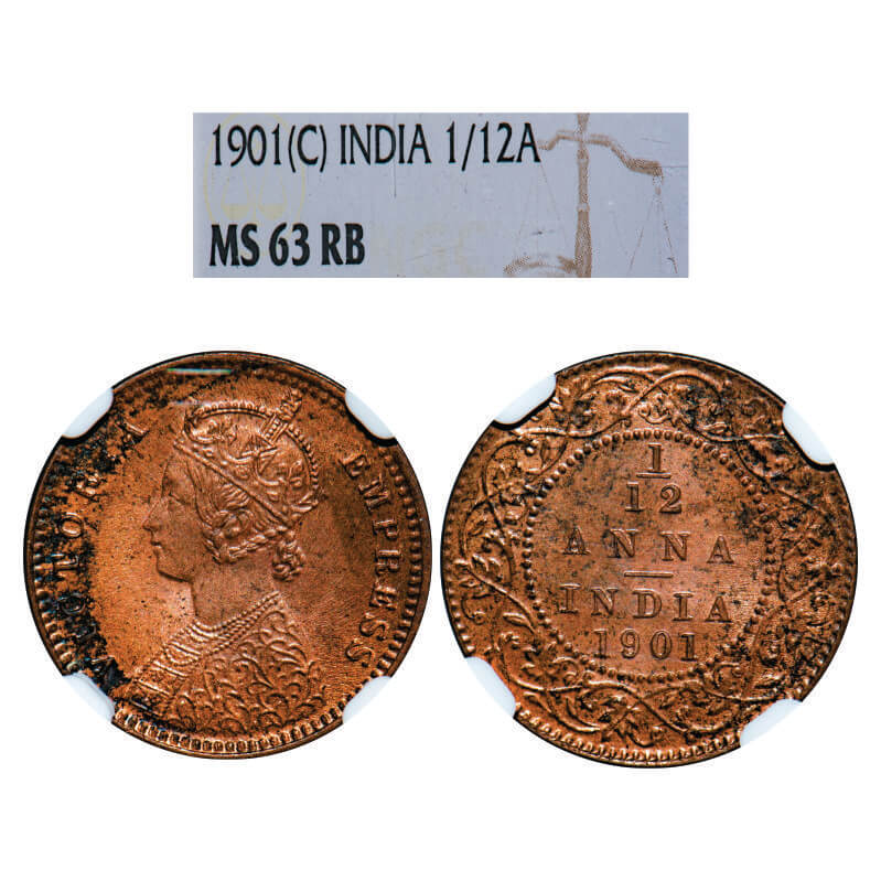 Victoria Empress, Copper, 1/12 Anna, 1901, Calcutta Mint, Obv B, No mint mark. GK 921, F. Prid 805. NGC Slabbed MS 63 RB. Rare.