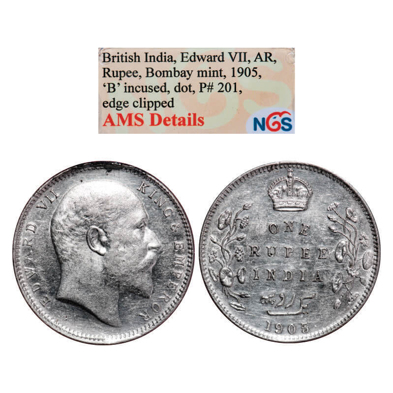 | Edward VII, Silver, Rupee, 1905, Bombay Mint, 'B' incused and dot, Top stroke of numeral 5 long, Clipped edge. GK 936, F. Prid 201. NGS Slabbed AMS, Details. Scarce. |