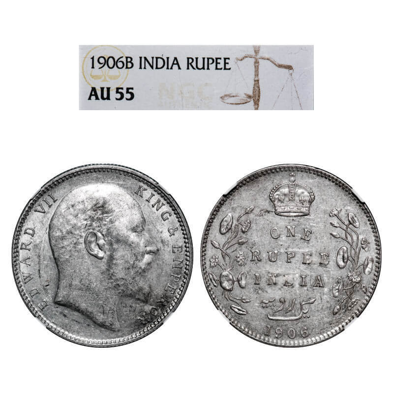 Edward VII, Silver, Rupee, 1906, Bombay Mint, 'B' incused and dot. GK 940, F. Prid 202. NGC Slabbed AU 55. Scarce.