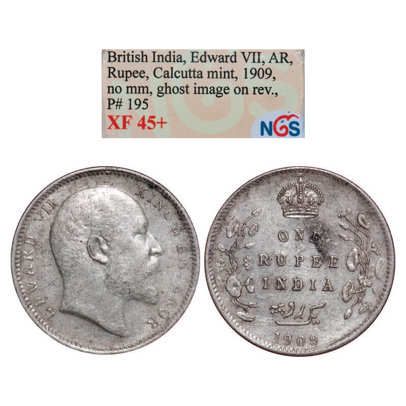 Edward VII, Silver, Rupee, 1909, Calcutta Mint, No mint mark, Ghost on Rev. GK 950, F. Prid 195. NGS Slabbed XF 45+. Very Scarce.