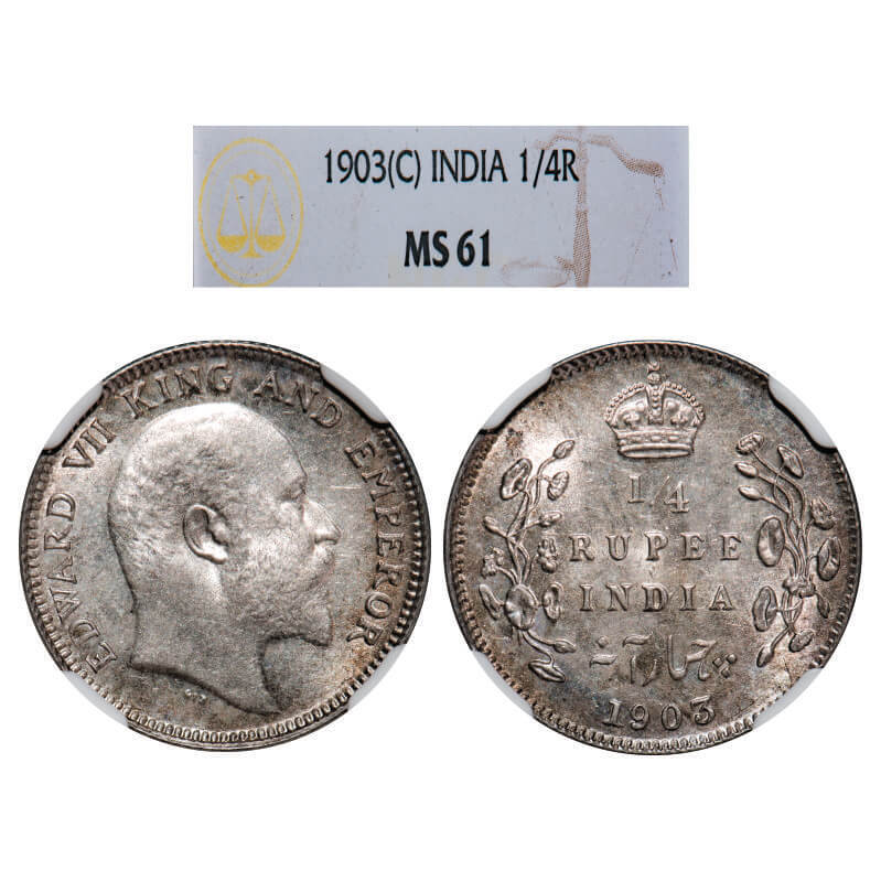 Edward VII, Silver, 1/4 Rupee, 1903, Calcutta Mint, No mint mark. GK 972, F. Prid 432. NGC Slabbed MS 61. Rare.