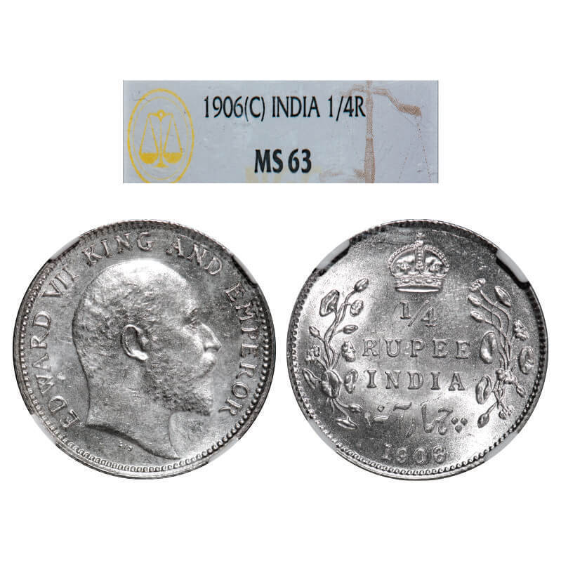 Edward VII, Silver, 1/4 Rupee, 1906, Calcutta Mint, No mint mark. GK 975, F. Prid 435. NGC Slabbed MS 63. Rare.
