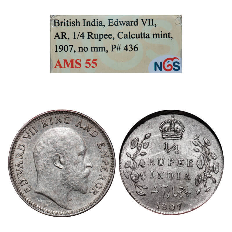 Edward VII, Silver, 1/4 Rupee, 1907, Calcutta Mint, No mint mark. GK 976, F. Prid 436. NGS Slabbed AMS 55. Very Scarce.