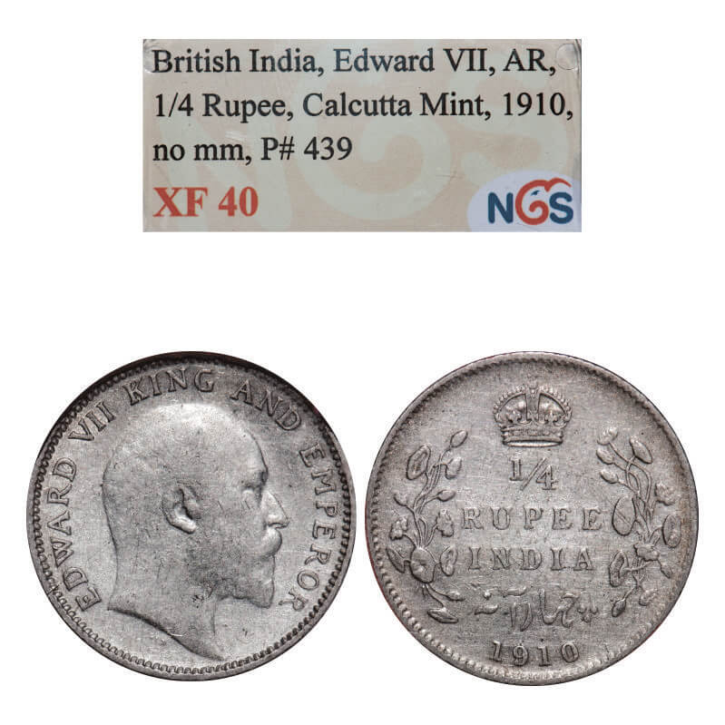 Edward VII, Silver, 1/4 Rupee, 1910, Calcutta Mint, No mint mark. GK 978, F. Prid 439. NGS Slabbed XF 40. Scarce.