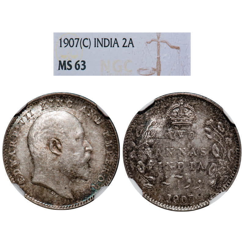 Edward VII, Silver, 2 Annas, 1907, Calcutta Mint, No mint mark. GK 984, F. Prid 560. NGC Slabbed MS 63. Rare.